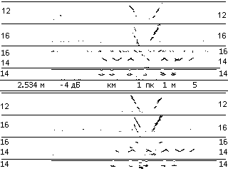 в) если на экране донный сигнал отсутствует, необходимо откатить дефектоскопную тележку на небольшое расстояние. Если в этом случае донный сигнал появляется в зоне строба, то следует тщательно осмотреть место, где наблюдалось пропадание донного сигнала. Причиной индикации может служить загрязнение поверхности катания, коррозия подошвы рельса в зоне подкладки, сварной стык или наличие дефекта.