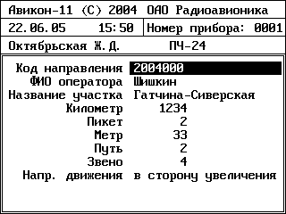 7.4.3 Установить необходимые начальные данные: код направления, ФИО оператора, название участка, километр, пикет, метр, путь, звено и направление движения дефектоскопа, для чего кнопкой « » или « » установить курсор на нужный пункт, нажать кнопку « », ввести кнопками «0»-«9» требуемое значение, либо кнопками « » или « » выбрать требуемую строку, затем снова нажать кнопку « ».