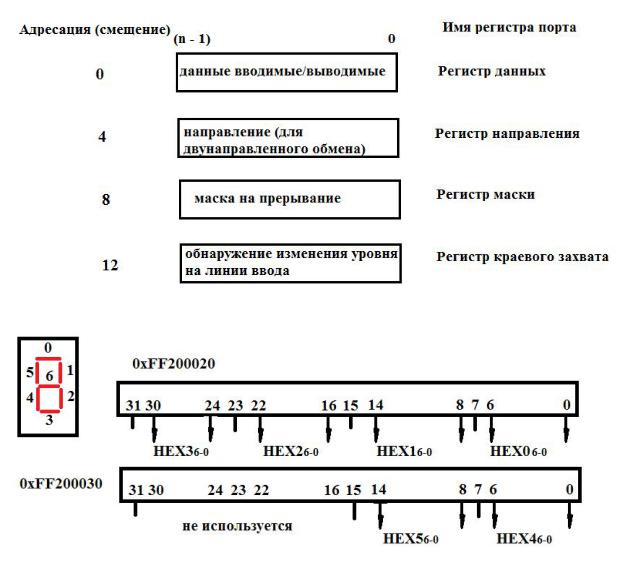 Схема подключения семисегментных индикаторов макета к регистрам данных внутренних портов.
