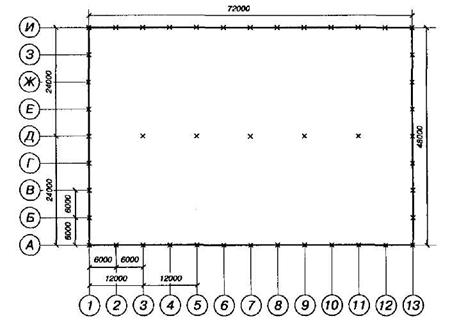 На чертеже планировки производственного корпуса наносятся также габаритные размеры, размеры шага колонн и пролетов, а также координатная сетка по колоннам для привязки производственных подразделений. Нумерацию элементов сетки начинают с левого нижнего угла здания и обозначают по шагу колонн арабскими цифрами, начиная с цифры 1, а по пролетам - заглавными буквами русского алфавита (рис. 3.1).