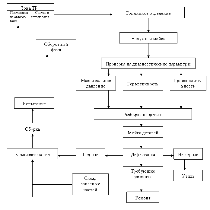 Узлы топливной системы, снятые с автомобилей, поступают на участок ремонта топливной аппаратуры. Здесь они проходят весь комплекс разборочно-сборочных и ремонтных операций (наружную мойку, разборку, мойку деталей, дефектацию, сортировку, ремонт (иногда восстановление), сборку и испытание).