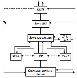 Если число автомобилей, возвращающихся с линии в единицу времени, больше пропускной способности зоны УМР, то часть автомобилей после КПП поступает в зону ожидания. Эти автомобили проходят УМР по мере ее освобождения. Как правило, пропускная способность зон ТО-1, ТО-2 и ТР также не позволяет принять на обслуживание все автомобили непосредственно после возвращения их с линии. Поэтому часть автомобилей ожидает ТО и ТР в зоне хранения или зоне ожидания.