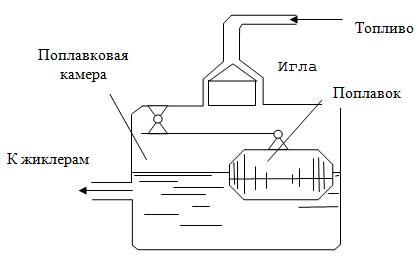 РЕШЕНИЕ: Принцип работы. При увеличении расхода топлива из поплавковой камеры уровень топлива уменьшается и поплавок опускается. Вместе с ним опускается игла, открывается запорный клапан и увеличивается приток топлива. В результате уровень топлива в поплавковой камере восстанавливается.