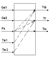 Gв1 - витрата охолоджуючої води кисневої фурми; Тф - температура охолоджуючої води на виході кисневої фурми;в1 - витрата охолоджуючої води газовідводу; Тг - температура газовідводу;к - тиск кисню;