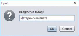 постачальника»);[2]=JOptionPane.showInputDialog («Введіть тип товару, який постачає