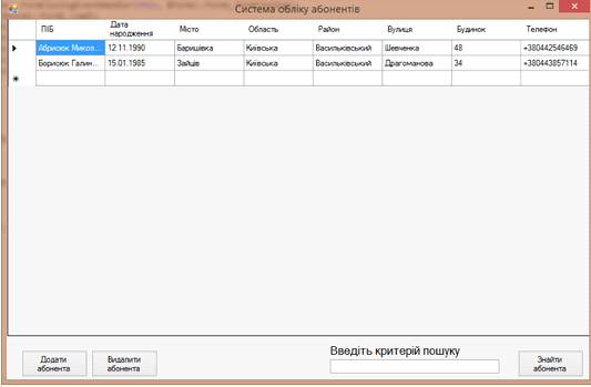 Пошук абонента за визначиними критеріями (ПІБ, область, район, номер телефону).