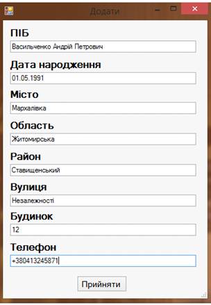 висновок, що і ця частина програми працює вірно. Вікно з добавленими даними