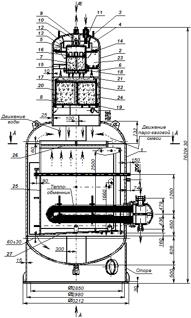 перегородками (поз. 10,12) і глухим днищем. Мала насадочна колона, Æ600 мм і висотою 400 мм, розташована в нижній частині обичайки