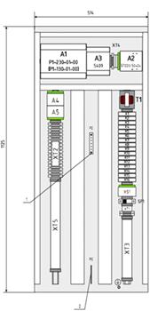 СУ конструктивно представляет собой шкаф, в котором размещается электрическое оборудование, контроллер и клеммники для подключения цепей питания, датчиков и цепей управления. Расположение элементов показано на схеме расположения. В верхней части монтажной панели расположен трансформатор питания контроллера Т1 (220/24 В), аккумуляторная батарея резервного питания, радиостанция с блоком питания. Ниже на монтажной панели расположены промежуточные реле для коммутации цепей управления общекустовым оборудованием. В средней части монтажной панели размещен контроллер (А1) с модулем питания (А2) и модемом (А3) [5]. В нижней части монтажной панели расположены клеммники для подключения внешних цепей: