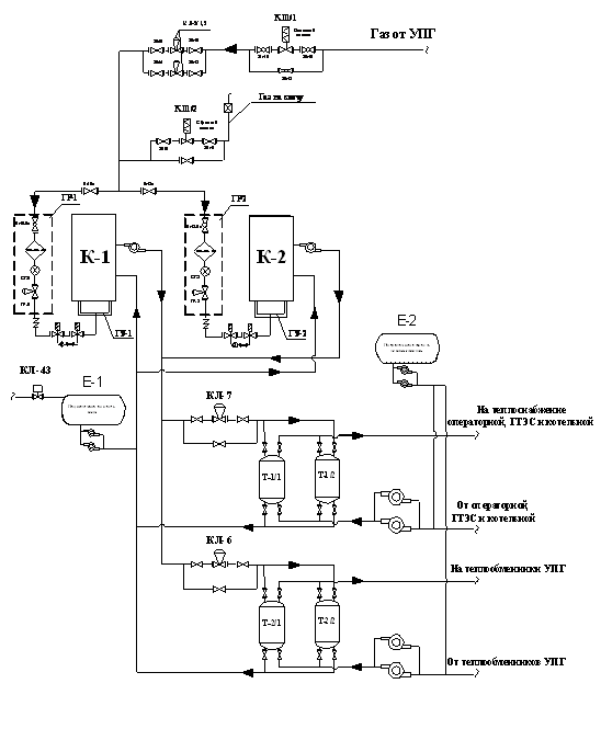 Система газоснабжения котельной организована следующим образом: газ на газовую рампу подается от газопровода установки подготовки газа, подключение которого предусмотрено после теплообменных аппаратов Т-1/1-4. На газопроводе на котельную установлены: узел отсечного клапана типа "нормально закрытого" КЛ-1/1, регуляторы давления КЛ-2/1,2 и узел отсечного клапана типа "нормально открытый" КЛ-1/2.