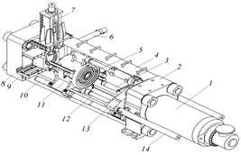 - рабочий (основной) цилиндр; 2 - задняя поперечина; 3 - пресс-штемпель; 4- колонны; 5 - контейнер; 6 - устройство перемещения матрицедержателя; 7 - устройство для отделения пресс-остатка; 8 - передняя поперечина; 9 - матрицедержатель (салазки); 10 - наклонные направляющие; 11 - контейнеродержатель;12 - цилиндры перемещения контейнера; 13 - подвижная поперечина; 14 - цилиндры двойного хода