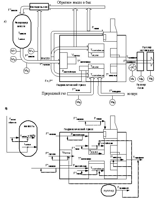 а) Схема материальных потоков и их информационных переменных; б) структурная схема САУ как объект управления.