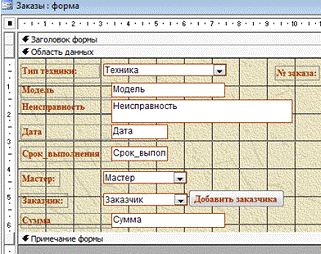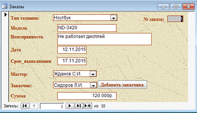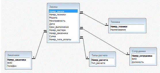 В качестве предметной области была выбрана тема «Автоматизация сервисного центра по ремонту бытовой техники». Процесс оформления заказов включает в себя множество повторяющихся действий, поэтому есть смысл автоматизировать его. БД о заказах кулинарии хранит информацию об ассортименте предприятия, клиентах и их заказах. Обеспечивает обработку вводимых, и вывод обработанных данных в виде отчетов.