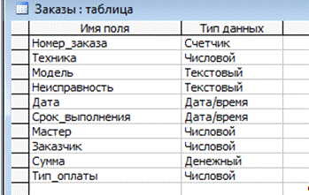 Рисунок 36 - Конструктор таблицы «Заказы»