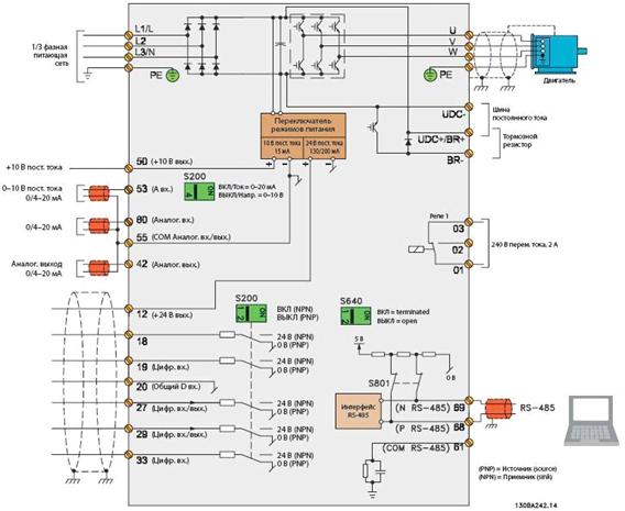 Звено постоянного тока состоит из неуправляемого выпрямителя и фильтра. Переменное напряжение питающей сети (L1, L2, L3) преобразуется в нем в напряжение постоянного тока (+, -).