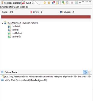 Методом assertEquals() тестового метода testMult() мы сравниваем действительное значение (то, которое получили в ходе выполнения метода mult() класса Main.java) с тем значением, которое нужно получить на выходе (в нашем случае значение заведомо ложное).