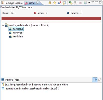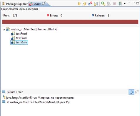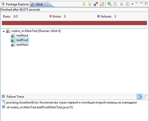 Здесь при тестировании мы проверяем были ли умножены матрицы, (testMain()), на введении нулевой размерности матрицы или не числового значения(testRead()), и на то, могут ли быть матрицы перемножены(testProd()).