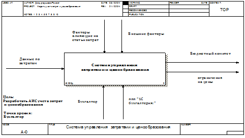 управление (Control), описывают правила, стратегии, процедуры или стандарты, которыми руководствуется работа «Учет затрат и ценообразования на предприятия». Таковыми на диаграмме являются «Факторы влияющие на статьи затрат», «Внешние факторы» входят в верхнюю грань работы.