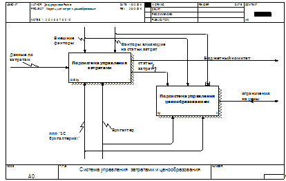 Декомпозиция контекстной диаграммы «Система управления затратами и ценообразования» представлена на рис. 2 и имеет номер А0. Данная диаграмма декомпозиции получается путем детализации контекстной работы на следующие виды работ: