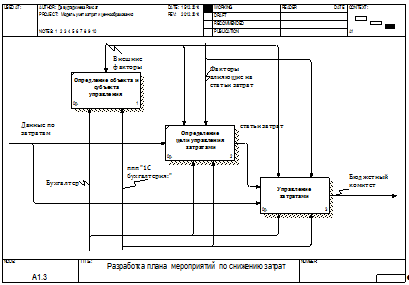 Для дальнейшей разработке курсового проекта была проведена еще одна декомпозиции в методологии IDEF0 работы «Разработка плана мероприятий по снижению затрат» (диаграмма А1.3), которая включает следующие работы и представлена на рис. 5: