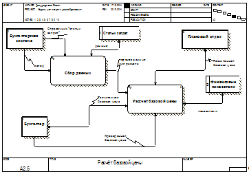 В диаграмме потоков данных (рис.7) под названием «Расчет базовой цены» показаны хранилища данных под названиями «Статьи затрат», «Финансовые показатели»,» Внешняя ссылка - «Бухгалтер» «Бухгалтерская система» и «Плановый отдел»