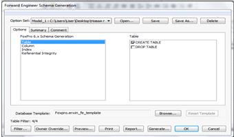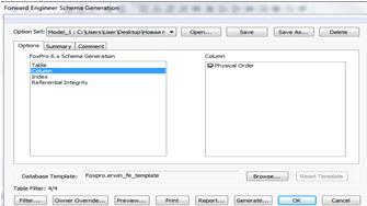 Каждый набор опций генерации может быть именован и использован многократно. Для загрузки, создания, переименования и удаления собственных наборов опций генерации используют комбинированный список Option Set и кнопки Open, Save, Save As и Delete диалога Forward Engineer Schema Generation.