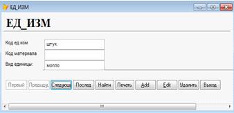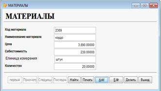 Данные о материалах содержится информация: код материала, наименование материала, цена, себестоимость, единица продукции.
