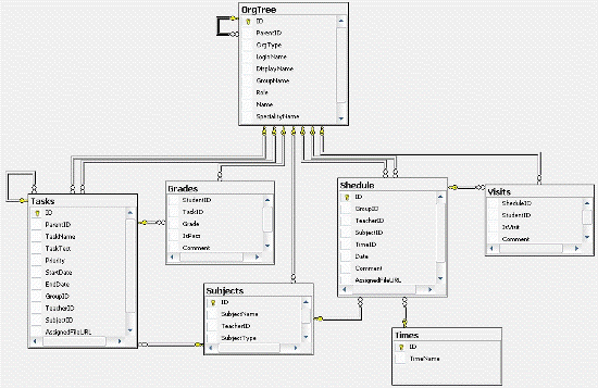 Таблица «OrgTree» содержит общую структуру, студентов, преподавателей, группы.