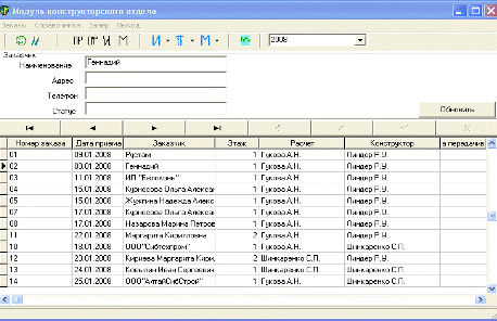 Модуль конструкторского отдела предназначен для планирования выезда на замеры к клиентам, а также для внесения первичных данных о клиентах, таких как: адрес, ФИО, телефон. Здесь же автоматически присваивается номер заказа по которому в дальнейшем можно осуществлять поиск клиентов. Также в модуль заносится информация - кто и когда из сотрудников выезжал на замеры.