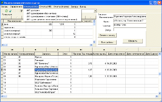 «Реестр оформленных заказов»; «Реестр изготовленных заказов»; «Реестр принятых заказов»; «Отчет по оплаченным заказам»; «Готовая продукция»; «Неготовая продукция»; «Отчет по вывезенным заказам»; «Дебиторская задолженность». Эти отчеты должны выводится на экран и печать.