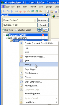Откроется стандартное окно сохранения файла. Выбираем имя и папку для сохранения проекта и жмем кнопку Save. Здесь поясню подробнее. Проект AD, это файл с описанием наличия документов и связей между ними. Все телодвижения по созданию документов, отчетов происходят относительно этого файла и пути в нем прописаны относительные. Соответственно новые файлы по умолчанию располагаются в папке в которой сохранен сам проект. Поэтому я рекомендую для каждого проекта создавать свою папку с уникальным названием. Ее впоследствии, безболезненно, можно перенести на другой компьютер, открыть проект и получить доступ ко всем его документам. Для примера, я создал папку E:\Altium projects\Outstage и сохранил проект с таким же именем. В дереве проектов обновилось название на - Outstage. Проект, как Вы понимаете – пуст. Исправим досадное недоразумение и добавим в проект лист схемы.