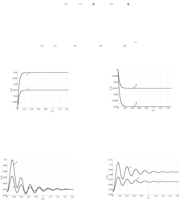 1 и 2 – значения асимптот экспоненты соответственно 0,015 м и 0,03 м Рисунок 7. – Кинематические возмущения на входе динамической системы при увеличении (а) и уменьшении (б) неровности