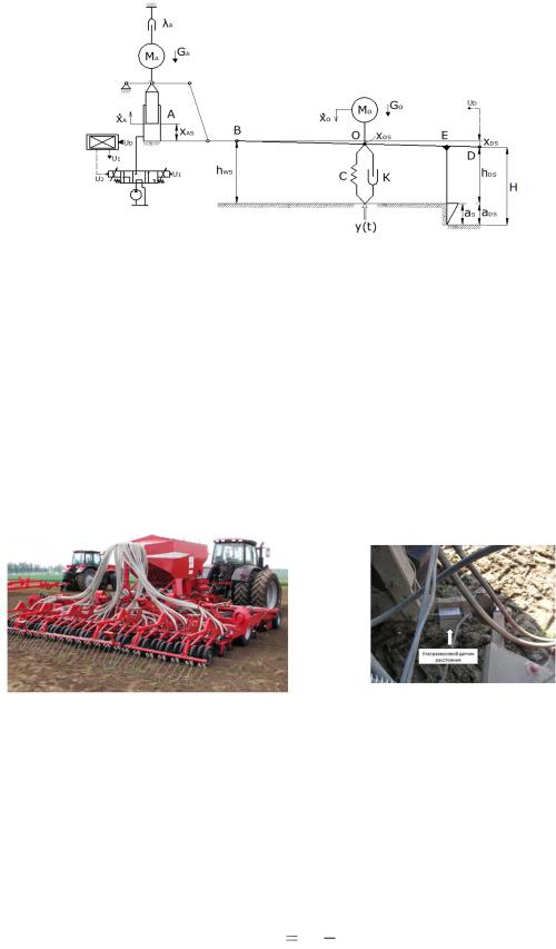 Расчетная схема (рисунок 3) на примере посевного агрегата описывает принцип высотного позиционирования рабочих органов без опорного колеса в районе соединительного звена (точка В, расположенная в установившемся режиме на высоте hBS) путем бесконтактного копирования рельефа поверхности.