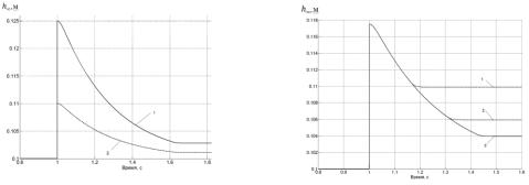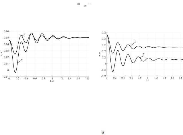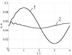 1 и 2 – процессы, соответствующие значениям асимптот экспоненты 0,015 м и 0,03 м Рисунок 9. – Изменение глубины обработки почвы агрегатом с замкнутой (а) и разомкнутой (б) системами управления при уменьшении неровности