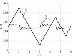 Рисунок 11. – Изменение глубины обработки почвы агрегатом с разомкнутой (1) и замкнутой (2) системами управления