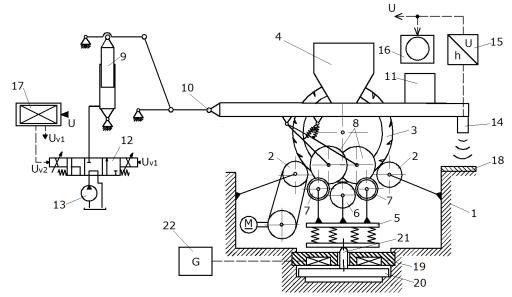 21 – толкатель; 22 – источник питания, UV1 и UV2 – управляющие воздействия