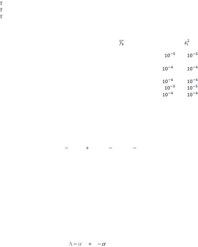 Примечания: *вектор-столбец фиктивной кодированной переменной х0; среднее значение откликов yа 'и yа'';*** разность между значением отклика в каждом опыте и средним значением; ****дисперсия в каждом опыте.