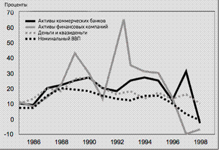 В период с 1990 по 1996 годы рост активов коммерческих банков и