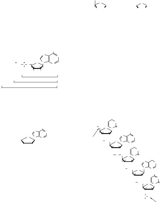 тиди є мономерними одиницями олігонуклеотидів і полінуклеотидів. Олігонуклеотиди містять у своєму складі кілька мономерів, а полінуклеотиди — багато. Роль містка між нуклеотидами виконує 3′,5′-фосфодіефірний зв’язок, який з’єднує С-3′-рибози (або 3′-дезоксирибози) одного нуклеотиду і С-5′ — другого. У зв’язку з цим полінуклеотидний ланцюг має певний напрямок: на одному кінці (початок ланцюга) залишається вільною 5′-ОН, на іншому — 3′-ОН група (кінець ланцюга) (рис. 4.2). Тому кінці лінійного (нерозгалуженого) полінуклеотидного ланцюга позначають 5′-кінець (ліворуч) і 3′-кінець (праворуч), оскільки написання ланцюга починають із 5′-кінця. У цьому випадку загальний напрямок утворення фосфодіефірних зв’язків у ланцюгу по-