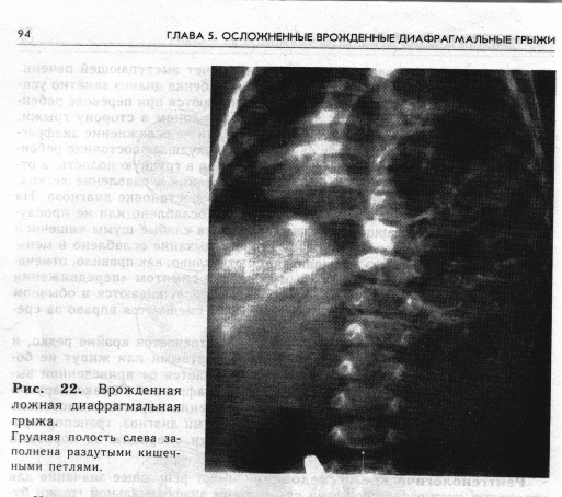Рентгенологическое исследование имеет решающее значение для уточнения диагноза. Основными симптомами диафрагмальной грыжи будут резкое смещение границ сердца (чаще вправо) и появление в легочном поле ячеистых полостей неравномерной величины соответственно наполнению газом перемещенных петель кишечника. При обследовании ребенка в первые часы после рождения полости будут сравнительно мелкими, постепенно их количество увеличивается, и они становятся крупнее (рис. 22). Иногда при смещении в грудную полость желудка видна большая воздушная полость, имеющая грушевидную форму. В брюшной полости петли кишечника мало заполнены газом.