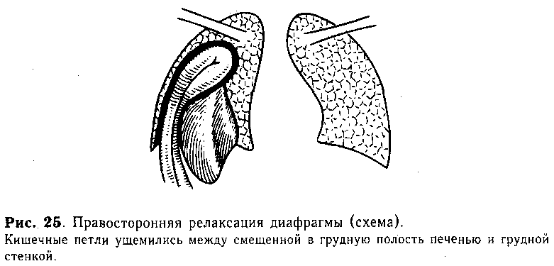 Ущемление истинных грыж собственно диафрагмы встречается крайне редко. Это связано главным образом с отсутствием четко выраженных {«жестких») грыжевых ворот или значительным их диаметром. При ограниченном дефекте диафрагмы ущемление проявляется внезапным началом. Клиническая картина характеризуется резкими болями в груди и животе, нарушением дыхания и явлениями кишечной непроходимости. Ущемление петель кишечника при релаксации диафрагмы мы наблюдали только у 1 ребенка (рис. 25).