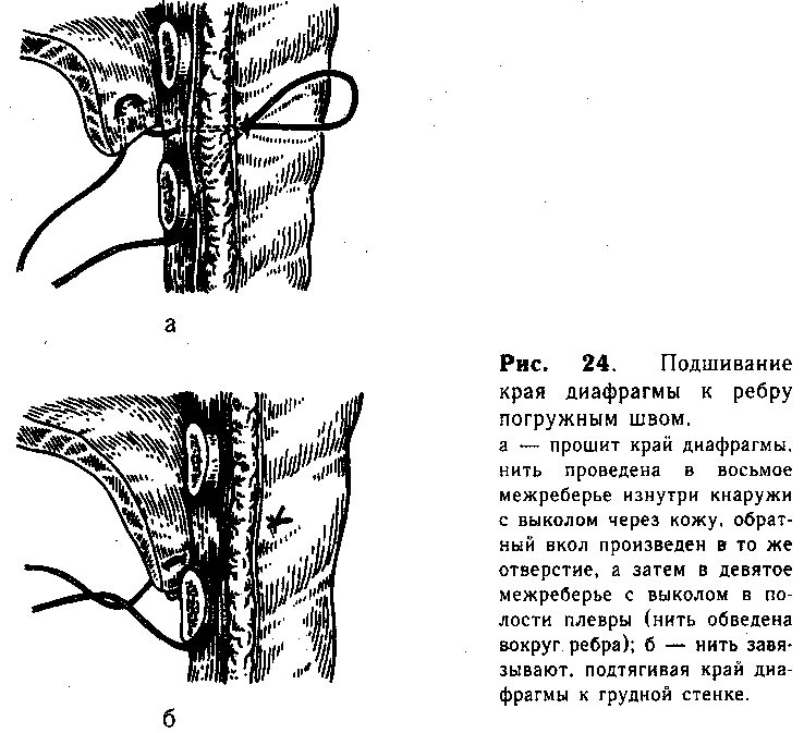 После низведения брюшных органов зашивают дефект диафрагмы. Эту часть операции выполняют различными способами, в зависимости от величины и расположения отверстия. Наиболее часто встречающийся задний щелевидный дефект ликвидируют путем сшивания его краев двумя рядами отдельных шелковых швов. В тех случаях, когда пристеночного мышечного валика нет, мы накладываем 1—2 укрепляющих «погружных» шв"а вокруг ребер. Для этого край диафрагмы прошивают П-образно прочной шелковой нитью (№ 4), один конец которой выводят длинной иглой в восьмом межреберье изнутри наружу с выколом через кожу. Обратный вкол производят в то же отверстие, проводят иглу вокруг ребра и выкалывают в полость плевры (рис. 24, а). При завязывании узла край диафрагмы подтягивают к грудной стенке, а снаружи шов погружают под кожу {рис. 24, б). Овальные или треугольные дефекты удается ликвидировать путем сближения краев диафрагмы (без освежения) отдельными матрацными или узловыми швами.