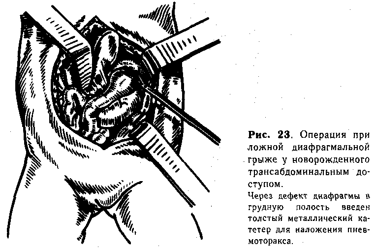 Лечение. При остром течении или ущемлении истинной грыжи собственно диафрагмы показана срочная операция. Предоперационная подготовка минимальна. Ребенка младшего возраста согревают после транспортировки, вводят необходимые для наркоза медикаментозные средства и накладывают аппарат для внутривенного вливания жидкости.