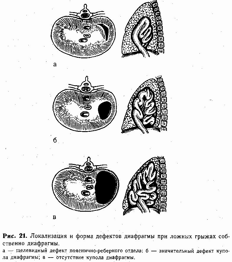 3) грыжи переднего отдела диафрагмы — парастернальные (истинные) в области грудинореберного треугольника (щель Лоррея) и фре-нико-перикардиальные, возникающие при наличии дефектов диафрагмы и перикарда (ложные). Аплазию (отсутствие) купола диафрагмы можно расценивать как обширную ложную грыжу собственно диафрагмы, а релаксацию относят к истинным грыжам с выпячиванием всего купола.