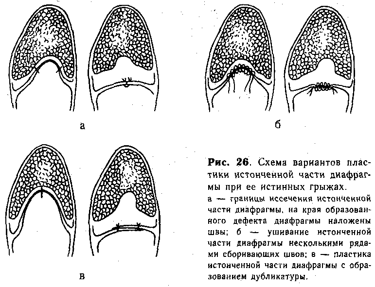 Если площадь истонченной сухожильной части диафрагмы превышает половину всей поверхности пораженного купола, то для пластики используют грыжевой мешок. Последний рассекают продольно, соответственно длинной оси, и подшивают к мышечной части (по краю ее) так, чтобы образовалась дубликатура из грыжевого мешка (рис. 26, в).