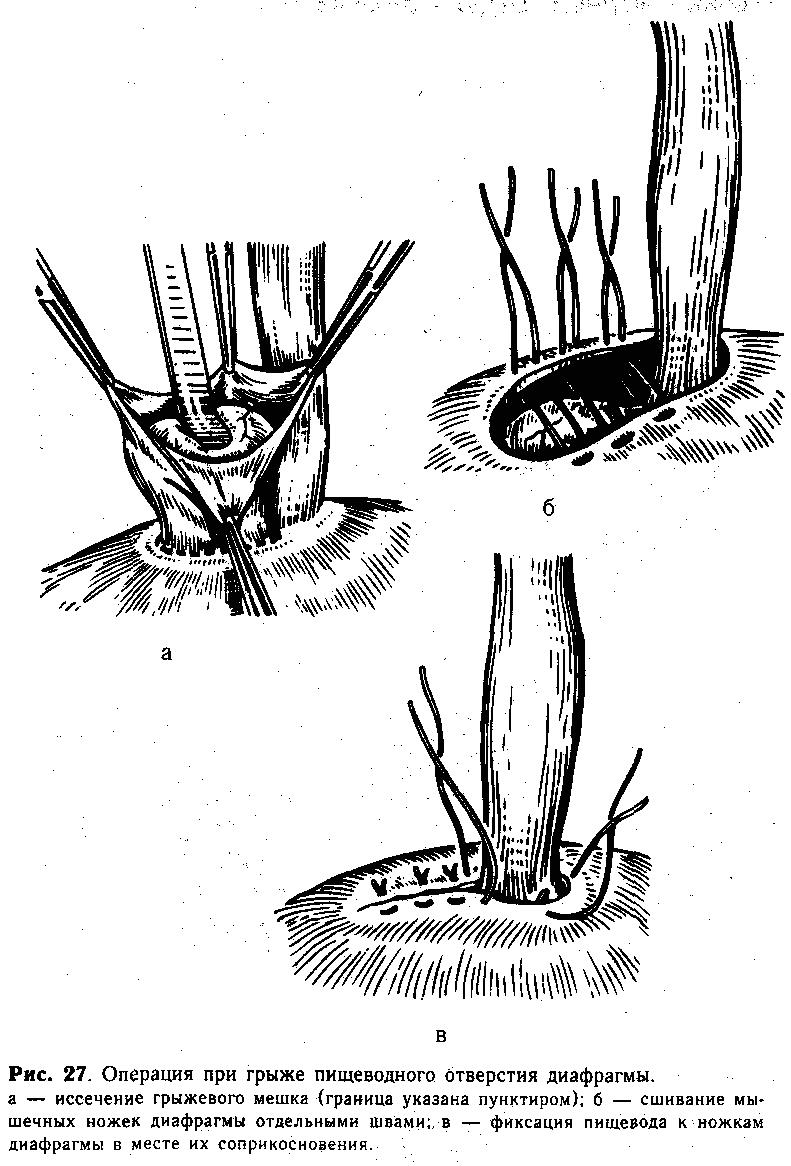 Техника операции. Положение больного — на боку. Под поясницу подложен валик, рука на стороне операции отведена и фиксирована к дуге операционного стола. В желудок через нос введен тонкий зонд. Разрезом по седьмому межреберью от сосковой до лопаточной линии послойно вскрывают грудную полость. Производят тщательный гемостаз. В нижнем отделе заднего средостения, около пищевода, обнаруживают грыжевой мешок, который рассекают продольно между пинцетами (рис. 27, а). Перемещенные органы осторожно низводят обратно в брюшную полость. Грыжевой мешок полностью иссекают (не травмировать блуждающий нерв!), затем мобилизуют кверху пищевод на 3—5 см. Медиальные ножки диафрагмы сшивают отдельными швами (1—2 ряда) под контролем зрения и пальца, захватывая в шов всю толщину мышцы (рис. 27, б); пищевод перемещают в переднеме-диальный отдел грыжевых ворот. Пищеводное отверстие суживают до таких размеров, чтобы оно свободно пропускало рядом с пищеводом палец хирурга. Пластику грыжевых ворот заканчивают фиксацией пищевода 2—3 швами к ножкам диафрагмы в месте их соприкосновения (рис. 27, в). Грудную полость послойно зашивают наглухо. Воздух из полости плевры отсасывают путем пункции.
