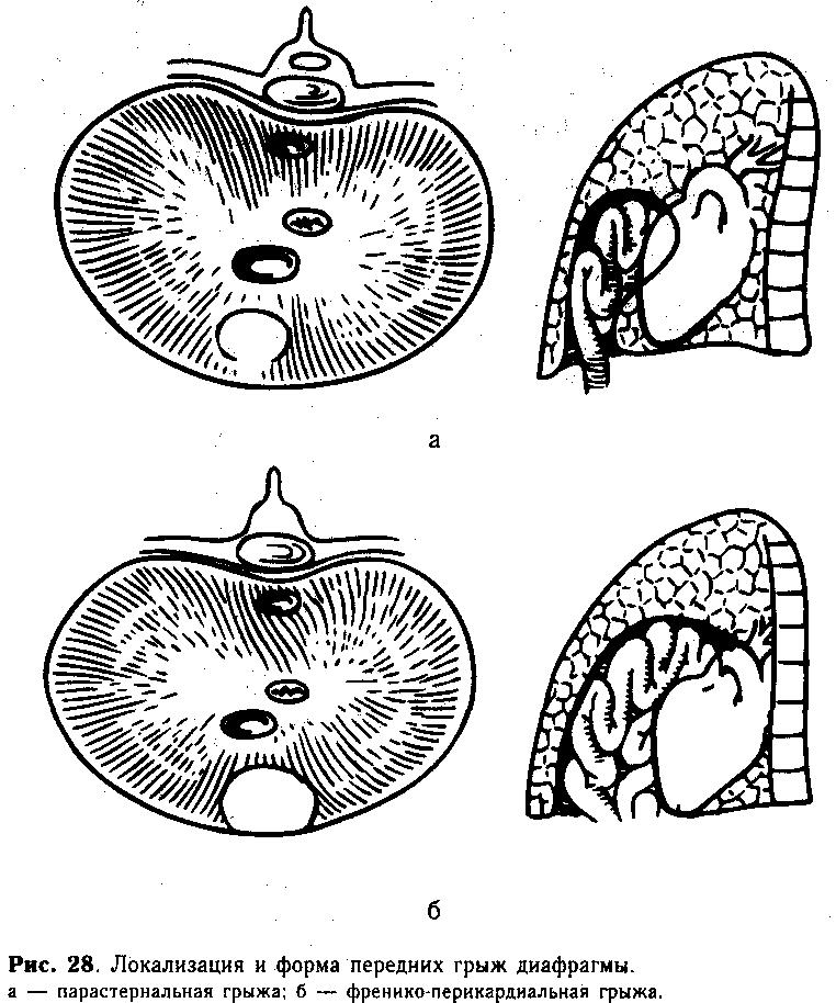 Перемещение органов брюшной полости через щель Лоррея или отверстие Морганьи в загрудинное пространство принято называть грыжами переднего отдела диафрагмы. Различают ларастернальные и фре-нико-перикардиальные грыжи (рис. 28). Мы оперировали 18 детей с грыжей переднего отдела диафрагмы; острое течение наблюдалось только у 5 больных с френико-перикардиальной формой грыжи.