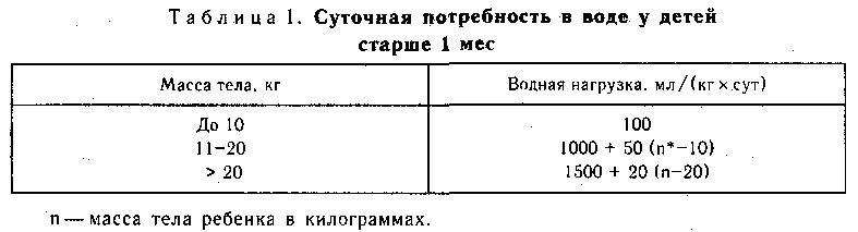 Существует несколько принципов расчета среднесуточной потребности в воде для детей различного возраста (номограмма Aberdeen, на 1 кг массы тела по Dennis, 1500 мл/м-, по потребностям основного обмена). Все они дают сходные расчетные объемы с колебаниями, например, для детей 1-го года жизни—150—200 мл/сут, которые обычно не имеют существенного значения. В связи с этим в последние годы мы применяем следующий простой расчет по энерготратам (Harris) (табл. 1).