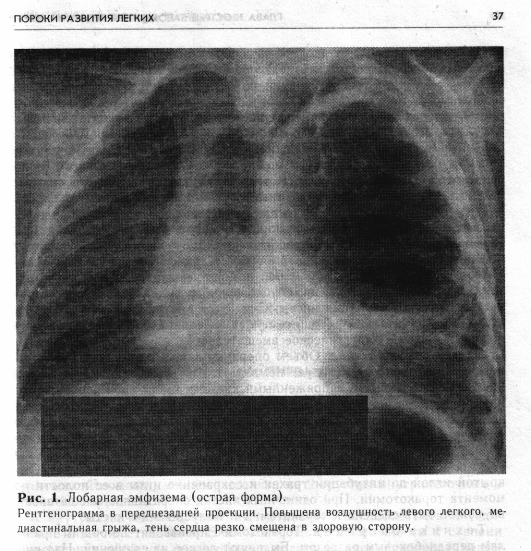 Острое течение обычно наблюдается у детей первых месяцев жизни (нередко вскоре после рождения). Заболевание проявляется прогрессивным нарастанием признаков дыхательной недостаточности. Общее состояние ребенка тяжелое, кожа бледная, с цианотичным оттенком; видны мелкоточечные подкожные кровоизлияния, губы синюшны. Определяется резкая одышка, в дыхании участвует вспомогательная мускулатура. Грудная клетка бочкообразной формы. Перкуторно над легочным полем на стороне поражения выявляется высокий тимпанит, при аускуль-тации дыхательные шумы отсутствуют. Границы сердца смещены в здоровую сторону. Тоны сердца приглушены.