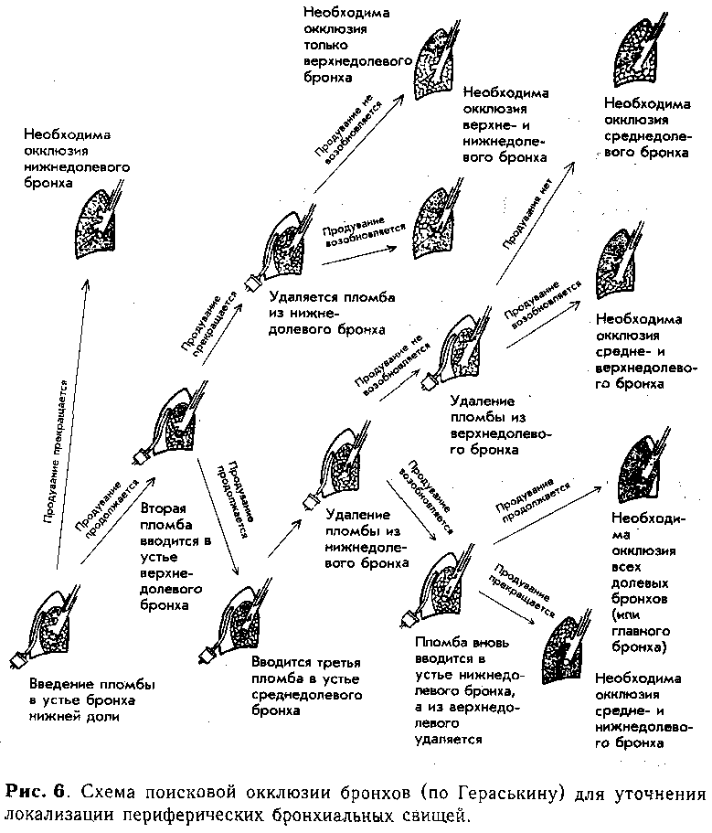При больших или множественных внутренних бронхиальных свищах иногда с помощью активной аспирации не удается создать отрицательное давление в плевральной полости и расправить легкое из-за большого сброса воздуха через свищи. В таких случаях допустимо [Бай-ров Г. А., Рошаль Л. М., 1991] уменьшить давление или вообще перевести больного на несколько часов (иногда на сутки) на пассивную аспирацию для того, чтобы свищ сузился, а затем снова приступить к активной аспирации. В подобных ситуациях эффективнее применение метода искусственной герметизации путем временной окклюзии бронха, несущего периферические бронхоплевральные свищи, по Rafinski—Гераськи-ну. При этом ценой временного ателектаза пораженной доли здоровые участки получают возможность немедленного расправления и участия в вентиляции (рис, 6).